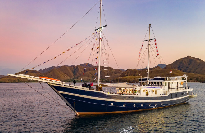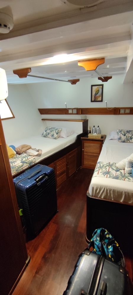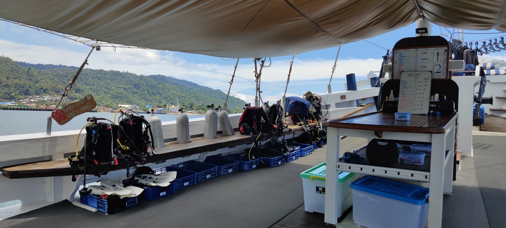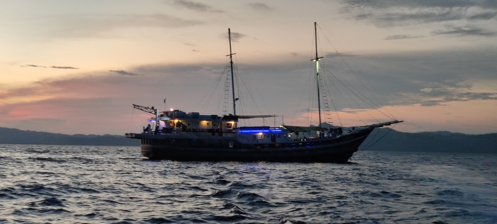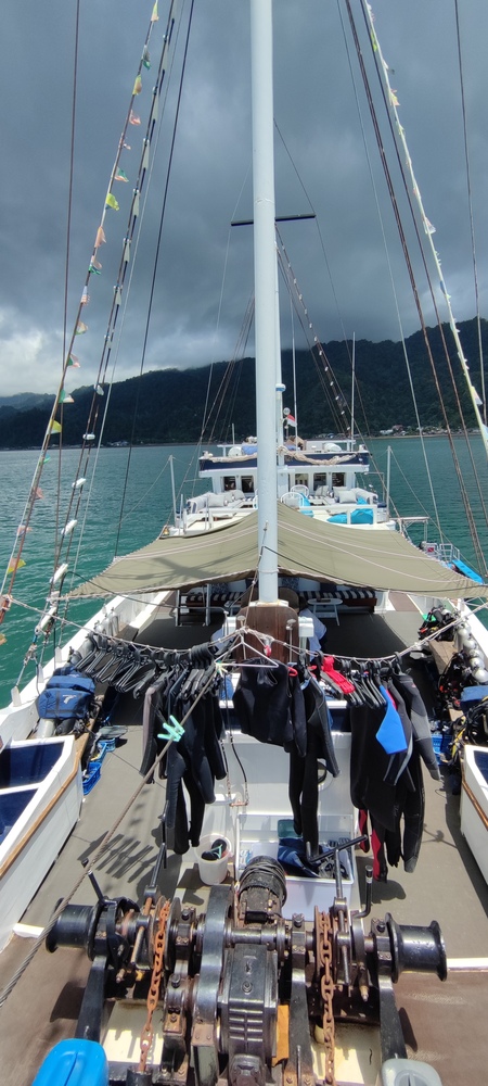 Die Seahorse ist ein sehr schönes Tauchschiff in traditionell indonesischer "Pinisi"-Bauweise. Das Tauchdeck befindet sich im vorderen, die Kabinen im hinteren Bereich. Wir hatten eine der schönen Upper-Deck Cabins, die 11-tägige Route war Ternate - Sorong.