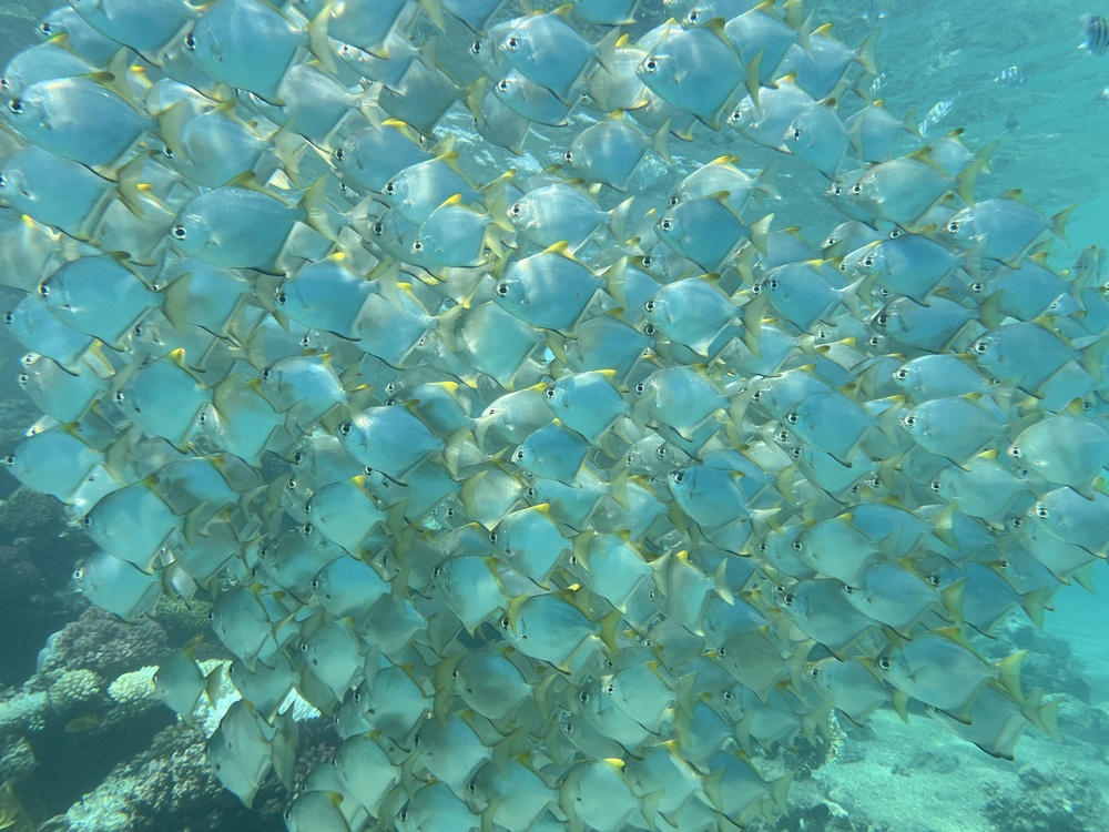 Schade, dass das Riff/ die KOrallen so mitgenommen sind … das Meer ist zu warm, 30 Grad und im Seichten noch darüber. Die Seegraswiese ist leider auch Vergangenheit.