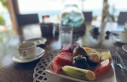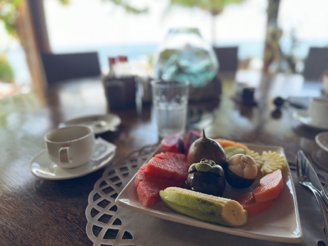 Wir hatten Halbpension gebucht. Zum Frühstück gibt es selbstgebackenes Brot und Brötchen, Marmelade, Eierspeisen, Säfte, Obst, gebratene Nudeln oder Reis. Zum Abendessen kann man zwischen á la Carte und Buffet wählen. Zum Abendessen trifft man sich vorher auf einen Drink und isst dann ab 19:30 Uhr gemeinsam unter freiem Himmel, was mir sehr gut gefallen hat. Man kann aber auch früher oder alleine essen, wenn man keine Lust auf Gesellschaft hat.