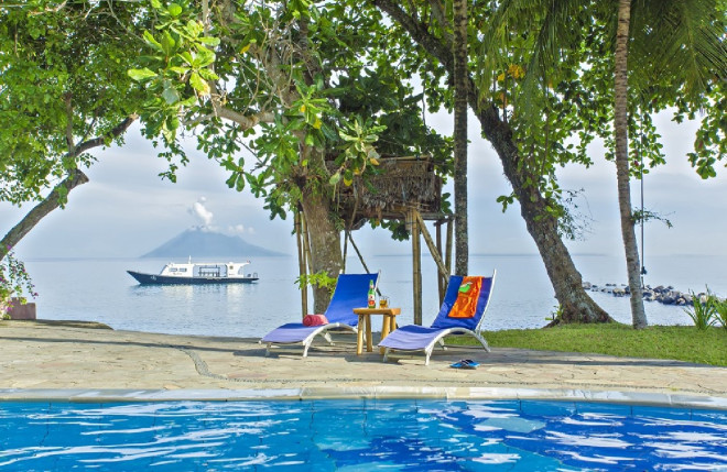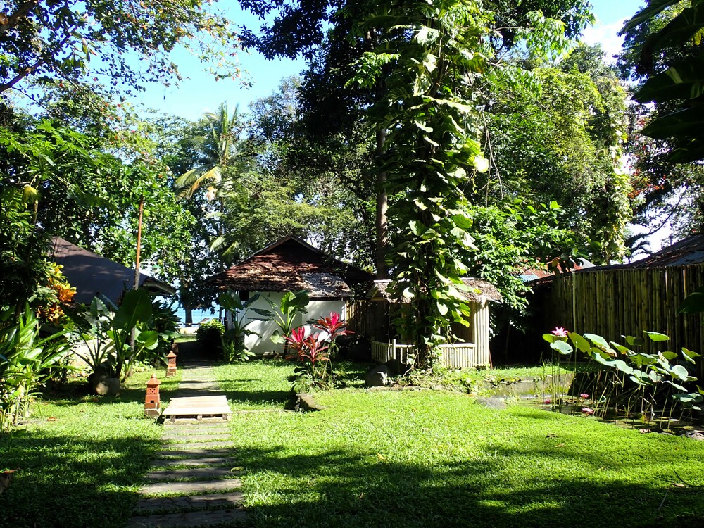 Das Murex-Manado ist ein schönes gemütliches Tauch-Resort inmitten eines schöner Gartenanlage mit kleinem Flusslauf und Seerosen- und Fischteich und einem schönen Blick auf den Manado Tua und die Bunaken.