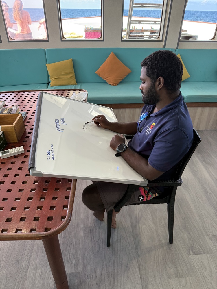 Wer bereits auf den Malediven getaucht ist, weiss, was einen erwartet. Alle anderen haben vermutlich schon zahlreiche Dokumentationen oder YouTube-Videos gesehen. Deshalb ganz kurz: Es ist genial! Die Sicht war in dieser Jahreszeit zwar begrenzt (teilweise 10–25 m), aber dank der hervorragenden Arbeit von Saaz, Wathey und Munkko konnten wir – auch unter erschwerten Bedingungen – viele wunderschöne Tauchgänge erleben. Das Dhoni ist etwas kleiner als bei anderen Booten, bietet aber sämtlichen Komfort. Die Tauchbriefings waren stets informativ, sehr ausführlich, mit handgezeichneten Karten – und einer Prise Humor. Ein besonders grosses Kompliment an Munkko, der während der Reise unsere Ansprechperson an Bord war. Mit deiner aufgestellten, humorvollen und kompetenten Art hast du wesentlich zum Erfolg dieser Reise und zur Gruppendynamik beigetragen – herzlichen Dank!