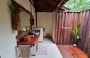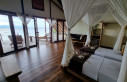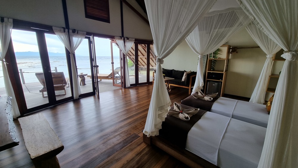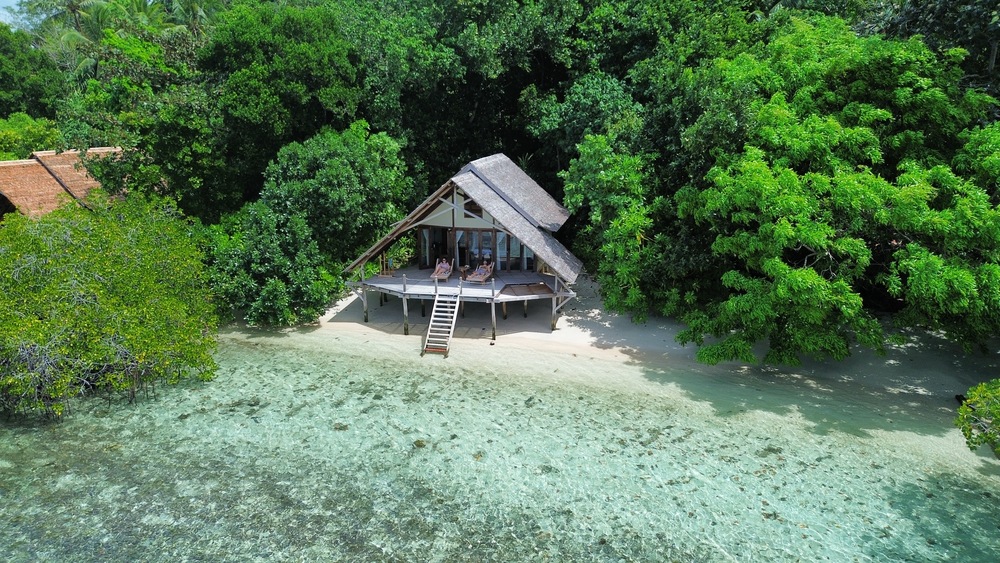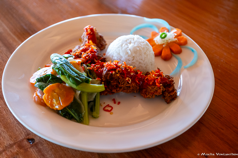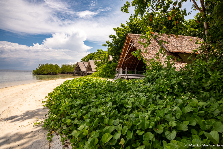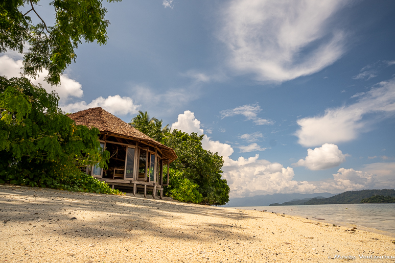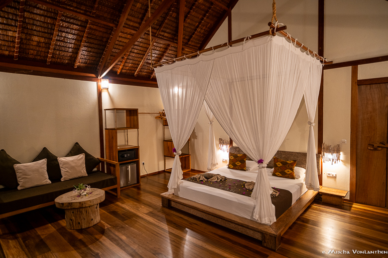 Nach einem kleinen Info Talk haben wir unsere Ocean Villa bezogen und es traf uns fast der Schlag, im positiven Sinne. Der Bungalow, eingebettet in die Mangroven, ist offen, geräumig und mit viel Liebe zum Detail eingerichtet. Vieles der Einrichtung ist aus Schwemmholz gefertigt und dadurch