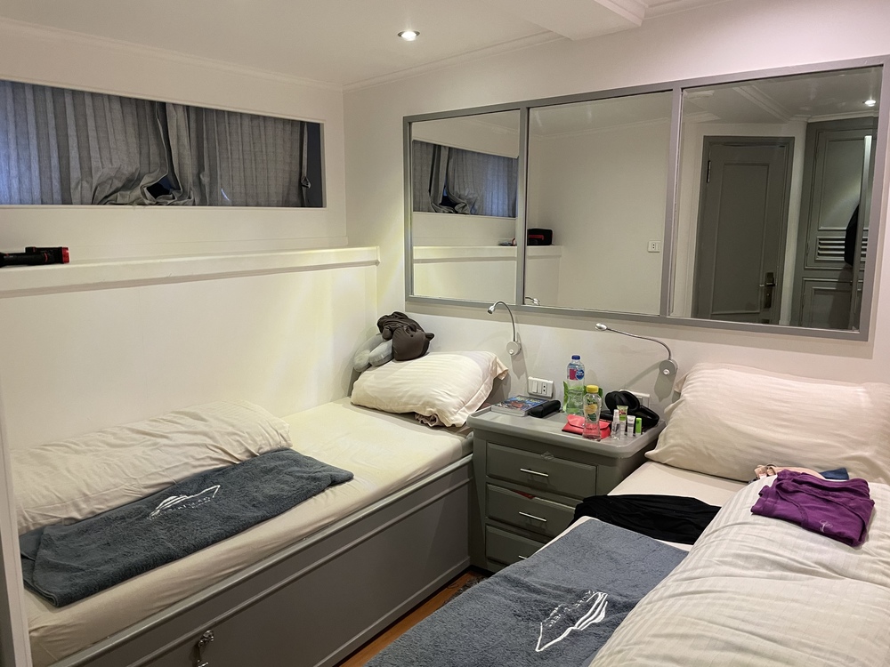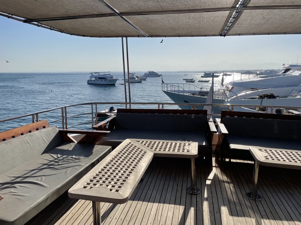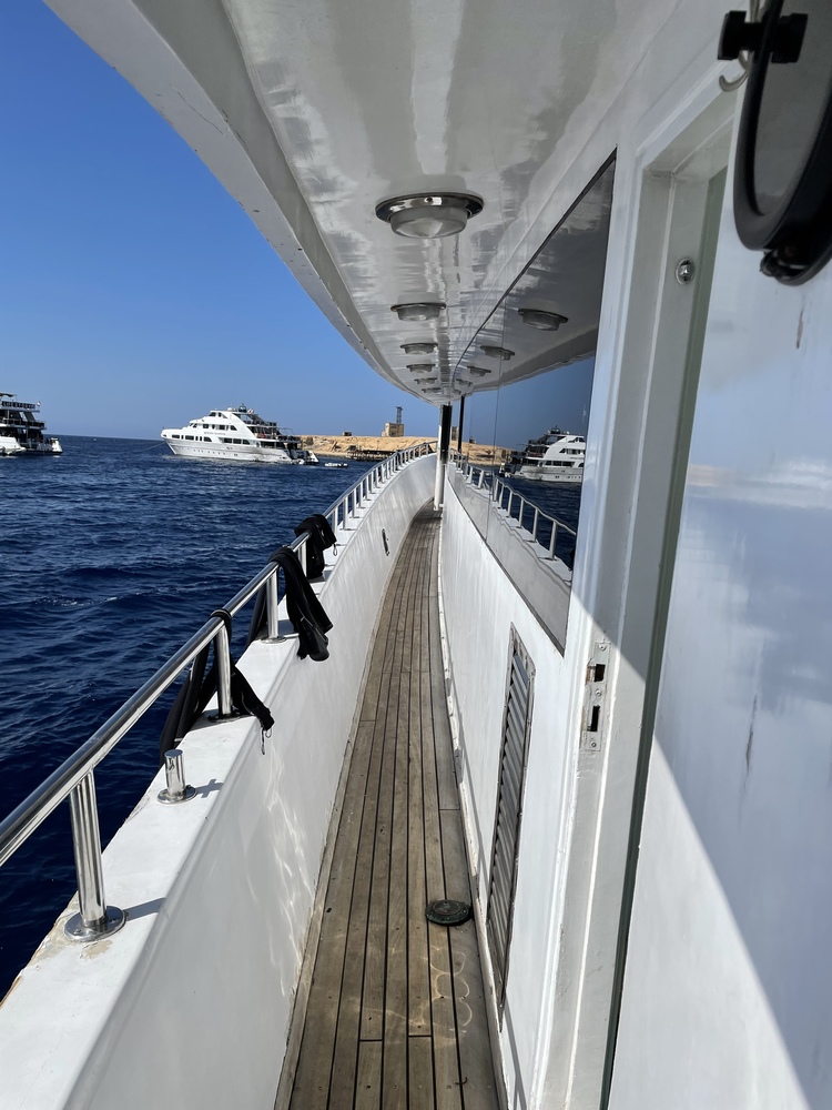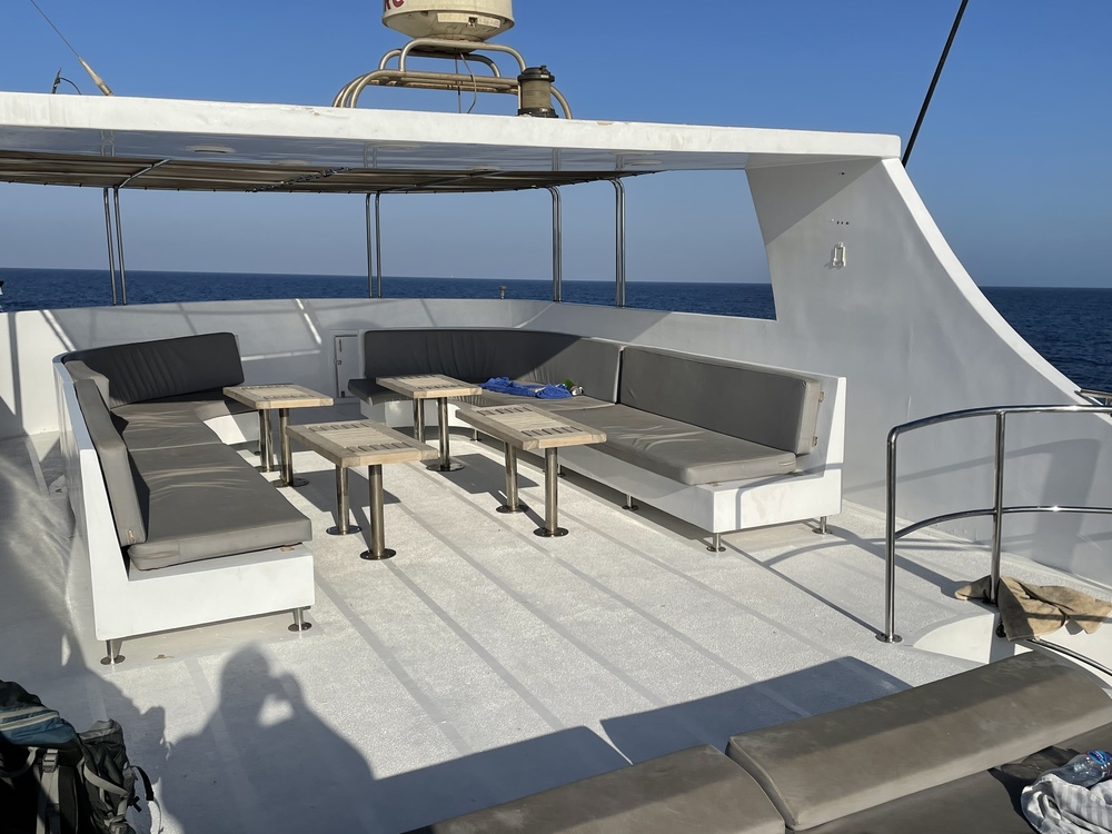 Der Zustand des Bootes ist sehr gut, wobei man dennoch das Alter in einigen Kabinenecken sieht und unser TV defekt war. Rettungswesten und blinkende Rauchmelder waren vorhanden und die Rettungswege wurden mehrfach erklärt. Der Router an Bord ist von Etisalat. Verbindung gab es auf unserer Route nur in der Stadtnähe von Hurghada (nicht Insel Giftun), bei Tiran und sporadisch mal bei Safaga. Es kam aber auch im Hafen vor, dass mein Handy zwar WLAN-Verbindung zum Router hatte, aber trotzdem Internet nicht funktioniert hat. Bei den Brother Islands gab es gar kein Netz, auch nicht von anderen Anbietern. Wer also permanent erreichbar sein will, sollte ein Satellitentelefon mieten.