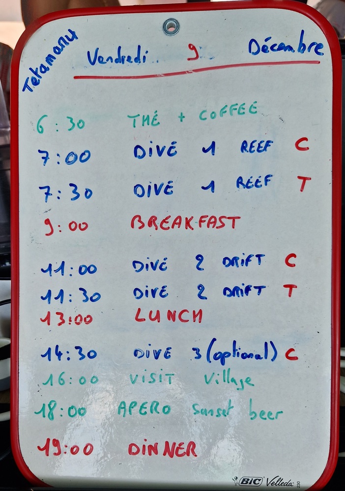 mit 12l und 15 l Stahlflaschen, damit spart man sich fast gänzlich einen Bleigurt. Daisy, unserer Köchin, versorgte uns gut und reichlich mit 3 Mahlzeiten am Tag und zwischendurch mit Keksen und Kuchen. Die Crew (Fred der Kapitän, die Guides Elodie, Victor und Julian)